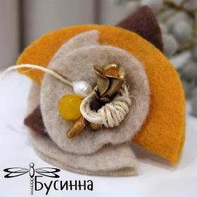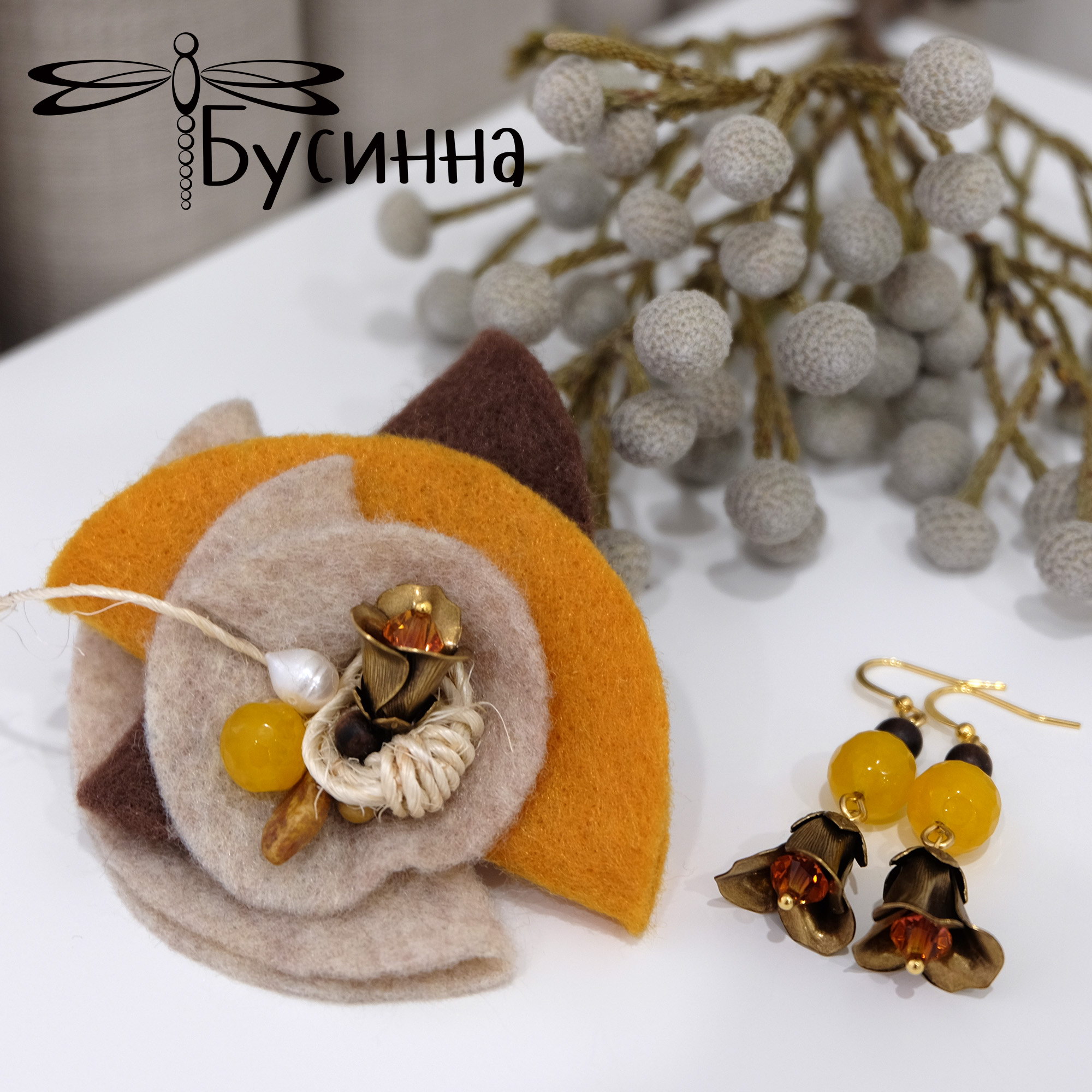 Комплект "Солнечный цветок" (2016) - фетр, кристаллы Сваровски, фурнитура США, фурнитура Южная Корея, шнур хлопковый, жадеит, жемчуг речной, бусина деревянная, бусина Чехия