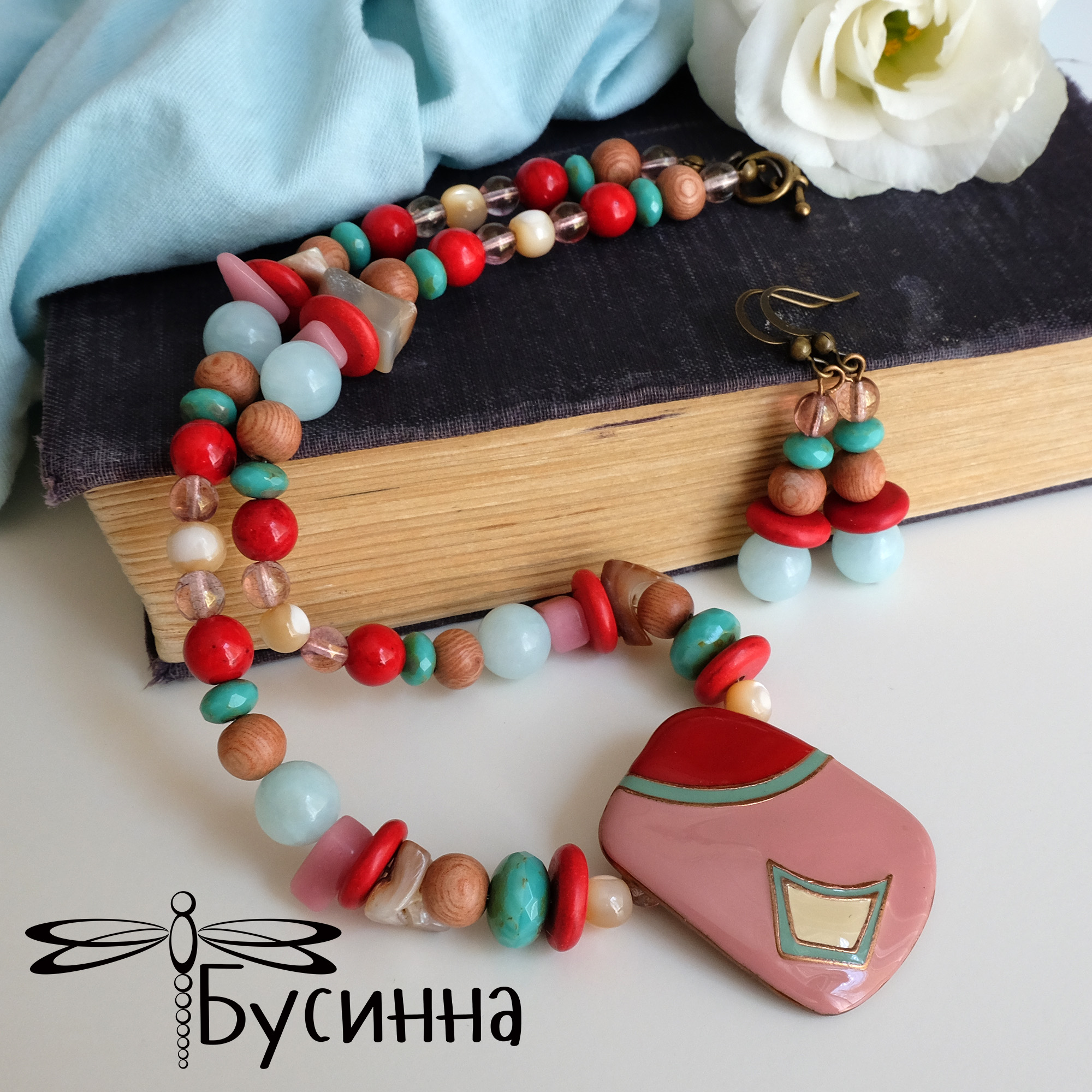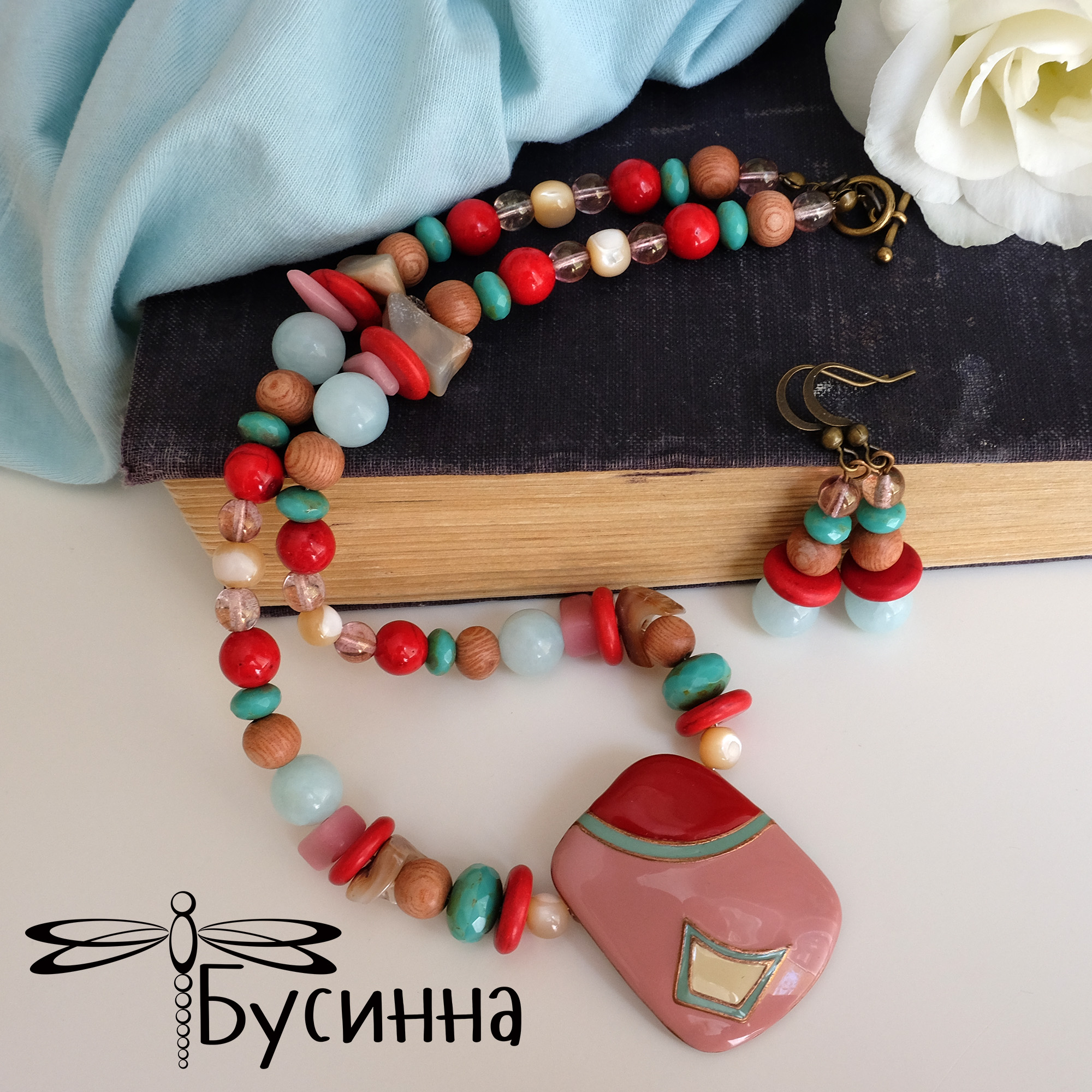 Колье и серьги "Стильная геометрия" (2018) - фурнитура США, бусина Чехия, бусина деревянная, говлит, перламутр, жадеит, бусина стеклянная, кулон (возраст 15 лет)