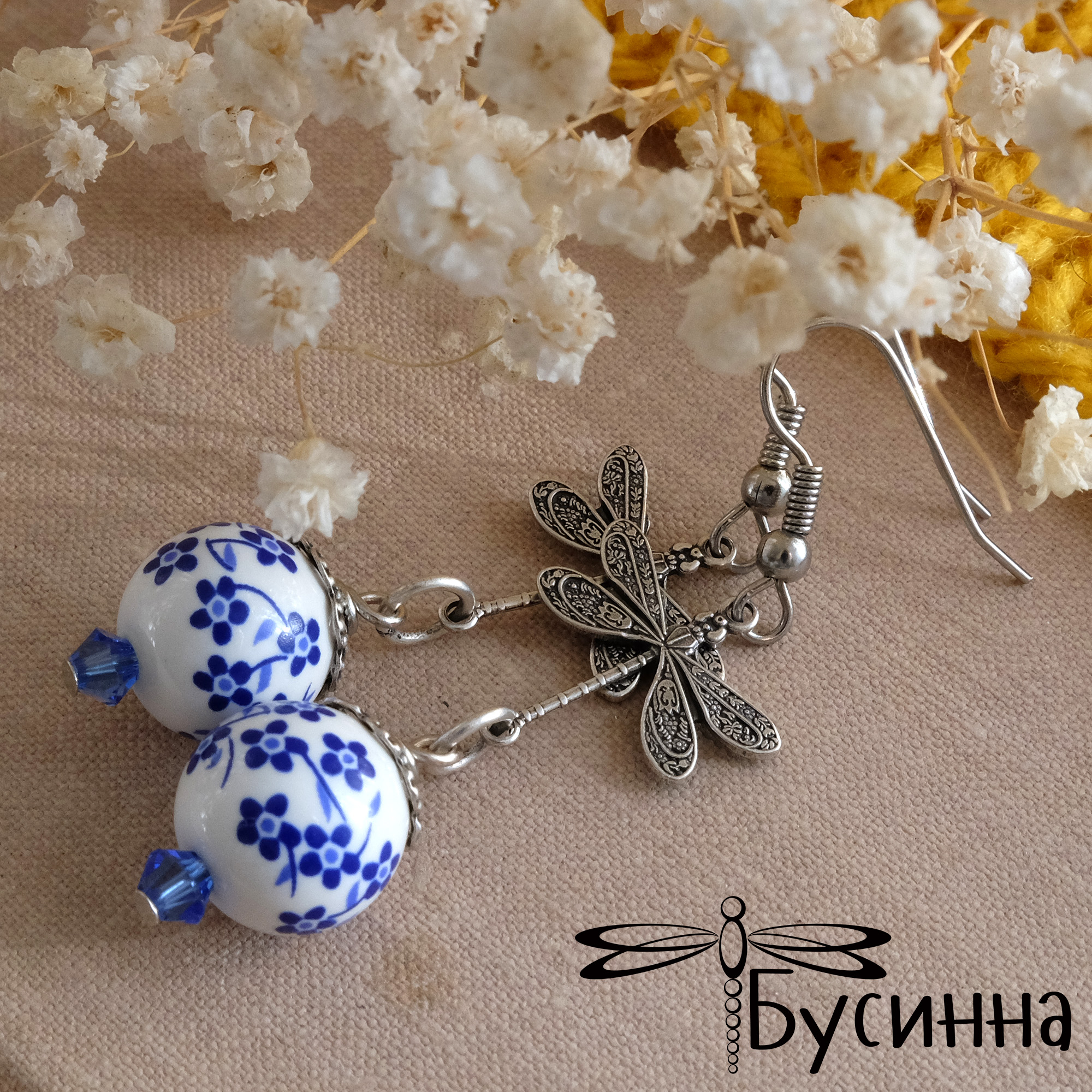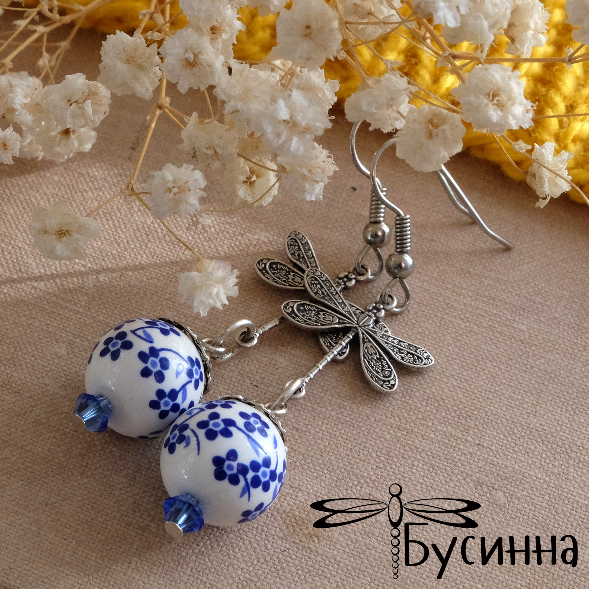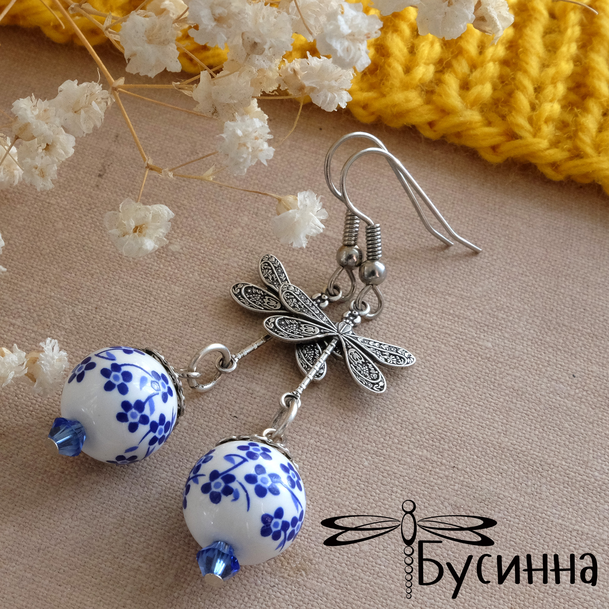Серьги " Стрекозы в синем" - кристаллы Сваровски, бусина керамическая, фурнитура США, фурнитура Чехия