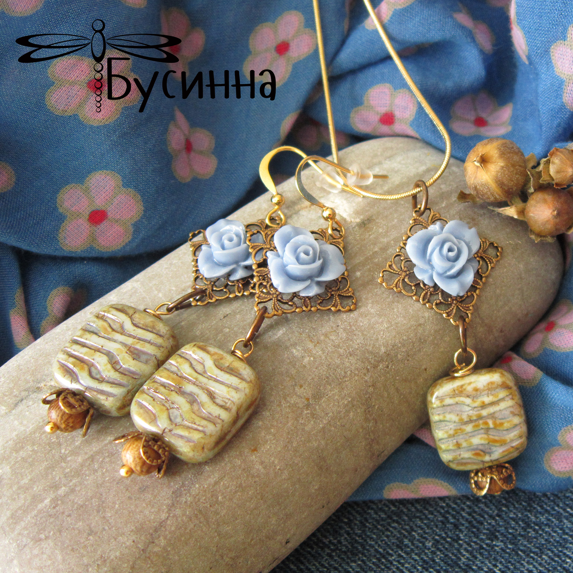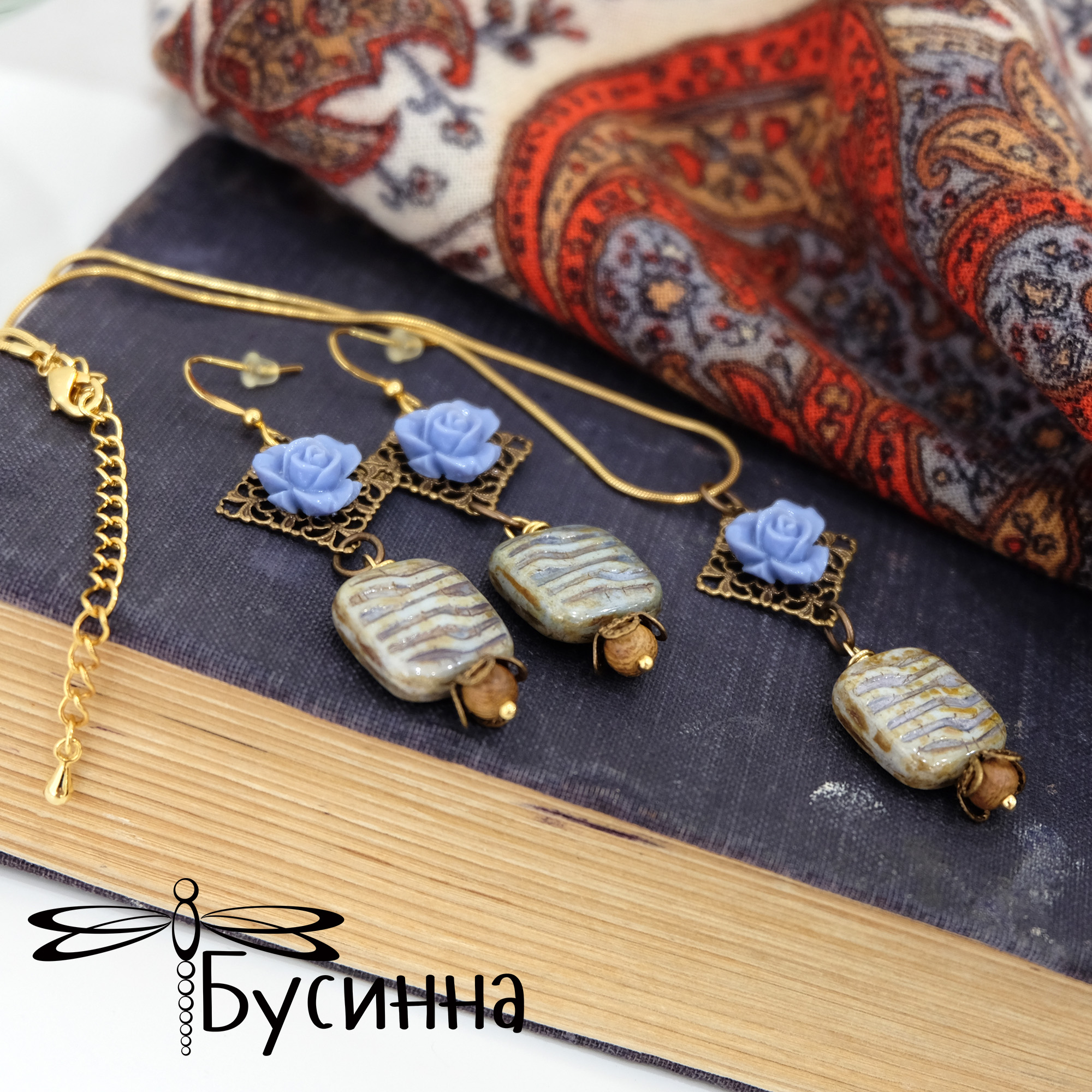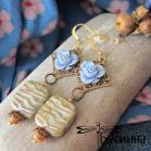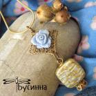 Кулон и серьги 'Теплый вечер' (2014) - бусина акриловая, бусина Чехия, бусина деревянная, фурнитура Южная Корея, фурнитура США Размер серьги без швензы около 5 см, размер кулона около 5,5 см, цепочка-змейка позолоченная 49 см (латунь (gold plated 14K), покрытие гипоаллергенное