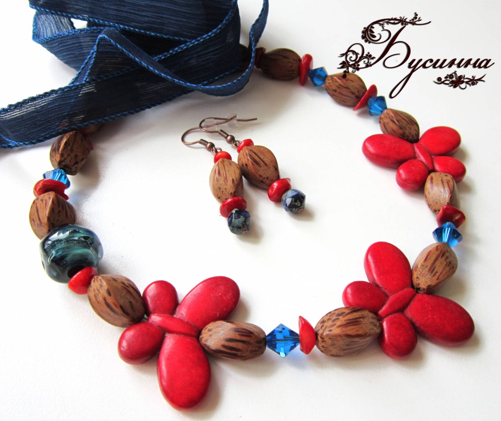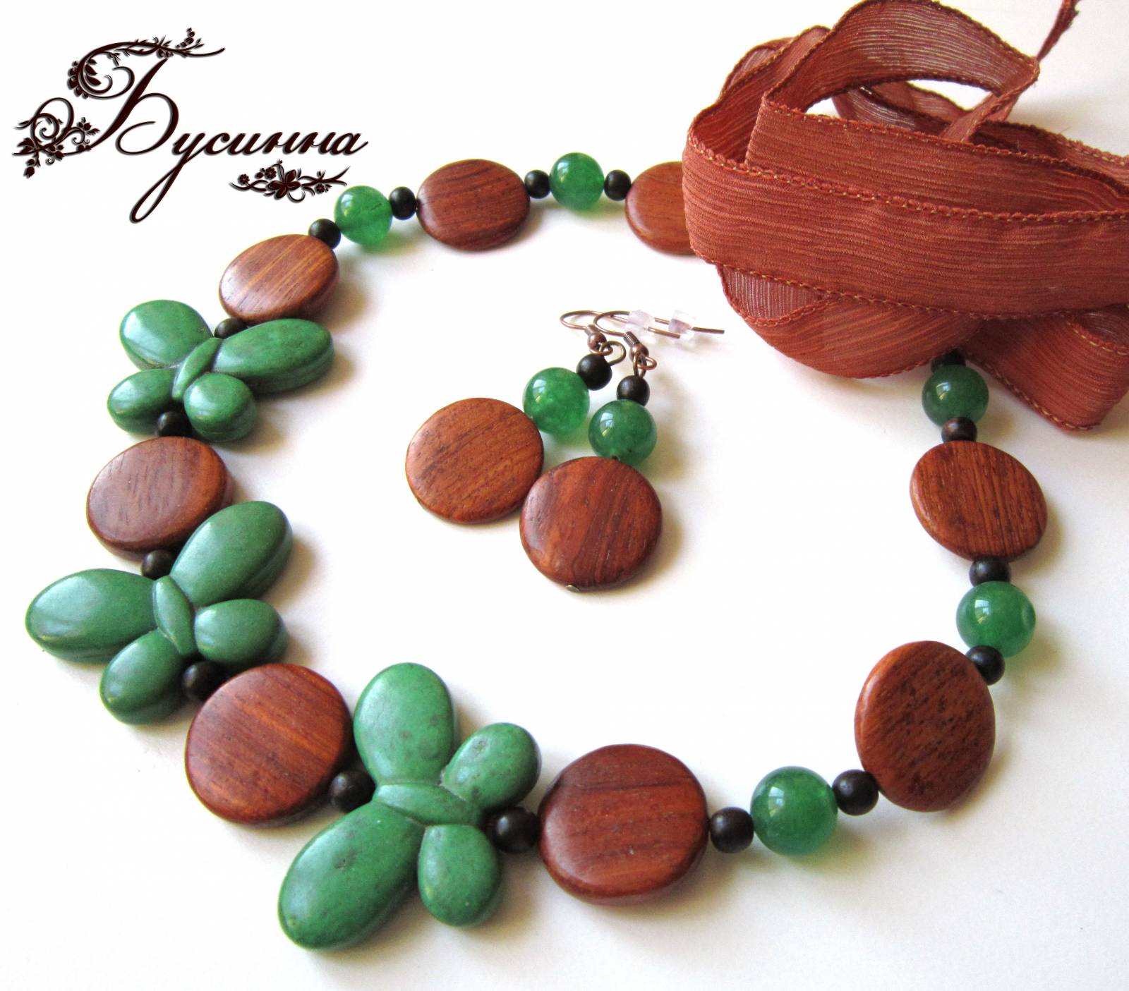 Размер бабочки около 2,5*3,5 см, размер бус регулируется с помощью шелковой ленты, размер серьги без швензы около 4 см