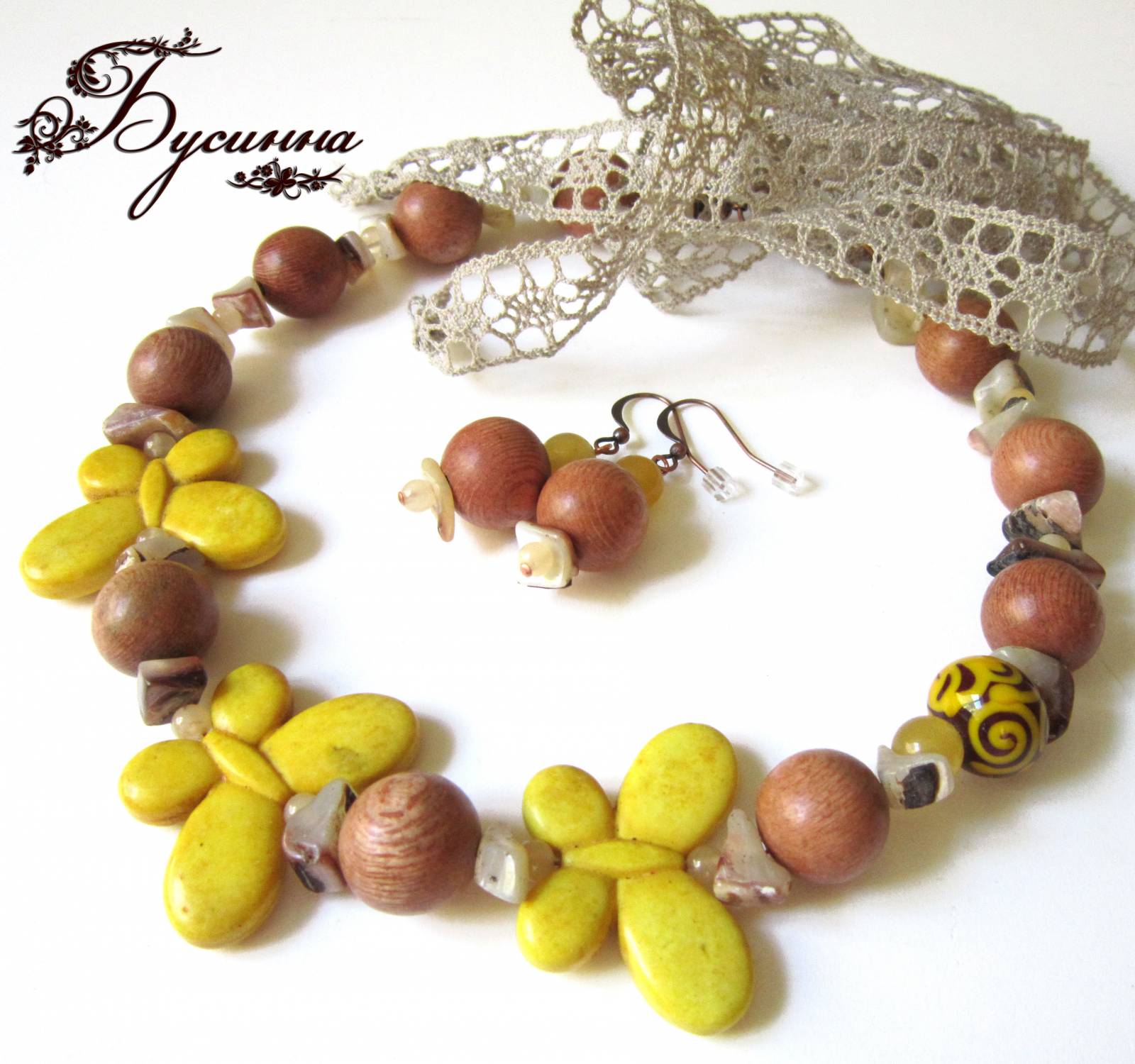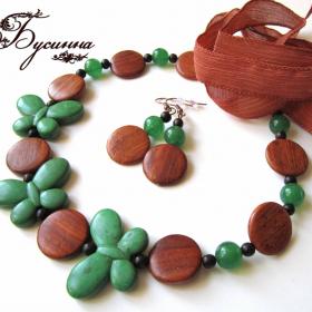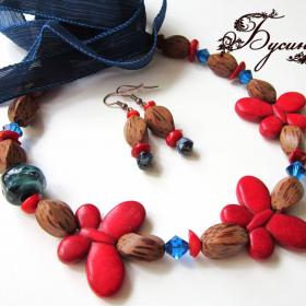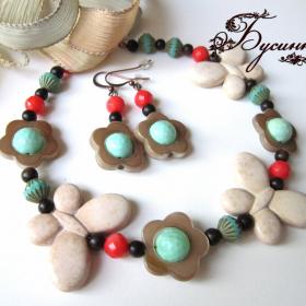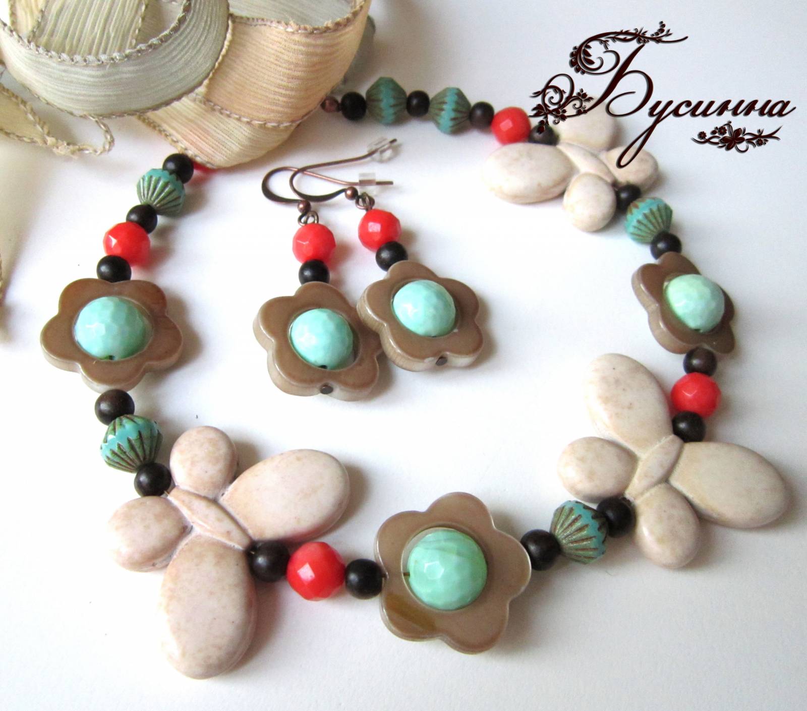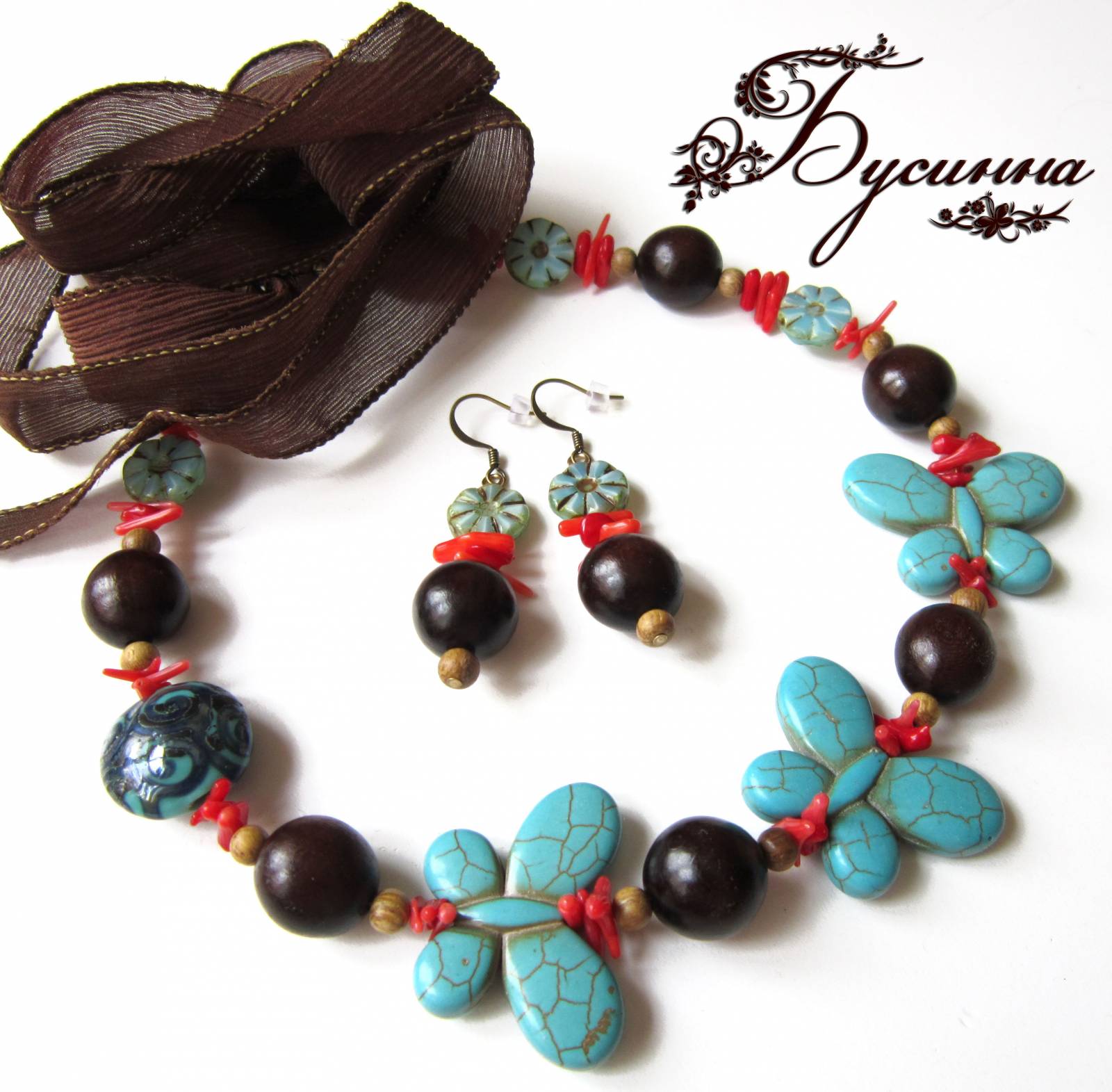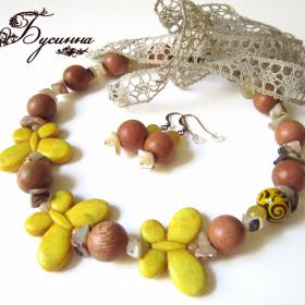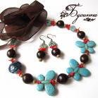 Бусы и серьги 'Тропические острова' бежевые, бирюзовые, желтые, зеленые, красные (2013) - агат, турквенит натуральный (говлит), перламутр, бусина Чехия, коралл, бусина ручной работы В. Балашовой, кристаллы Swarovski, кружево, бусина деревянная BAYONG, жадеит, бусина деревянная, лента шелковая, фурнитура. Размер бабочки около 2,5*3,5 см, размер бус регулируется с помощью шелковой ленты, размер серьги без швензы около 4 см