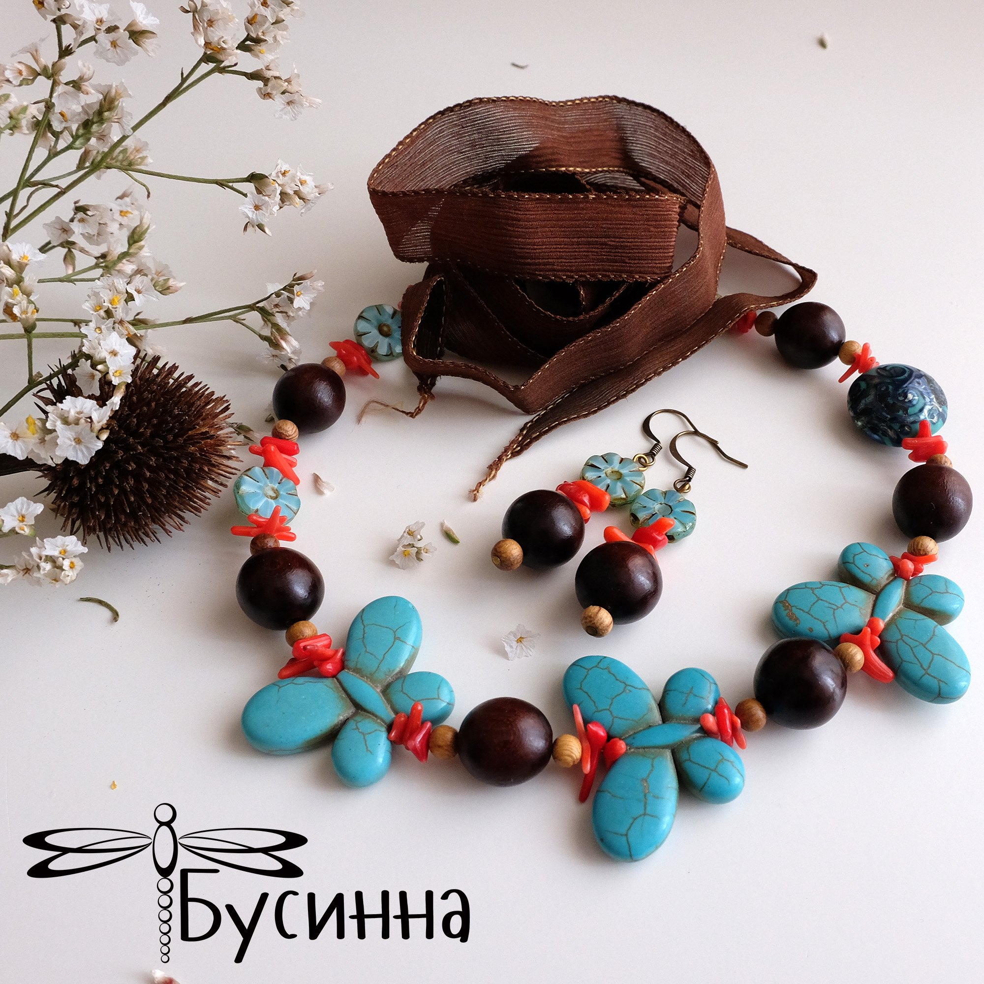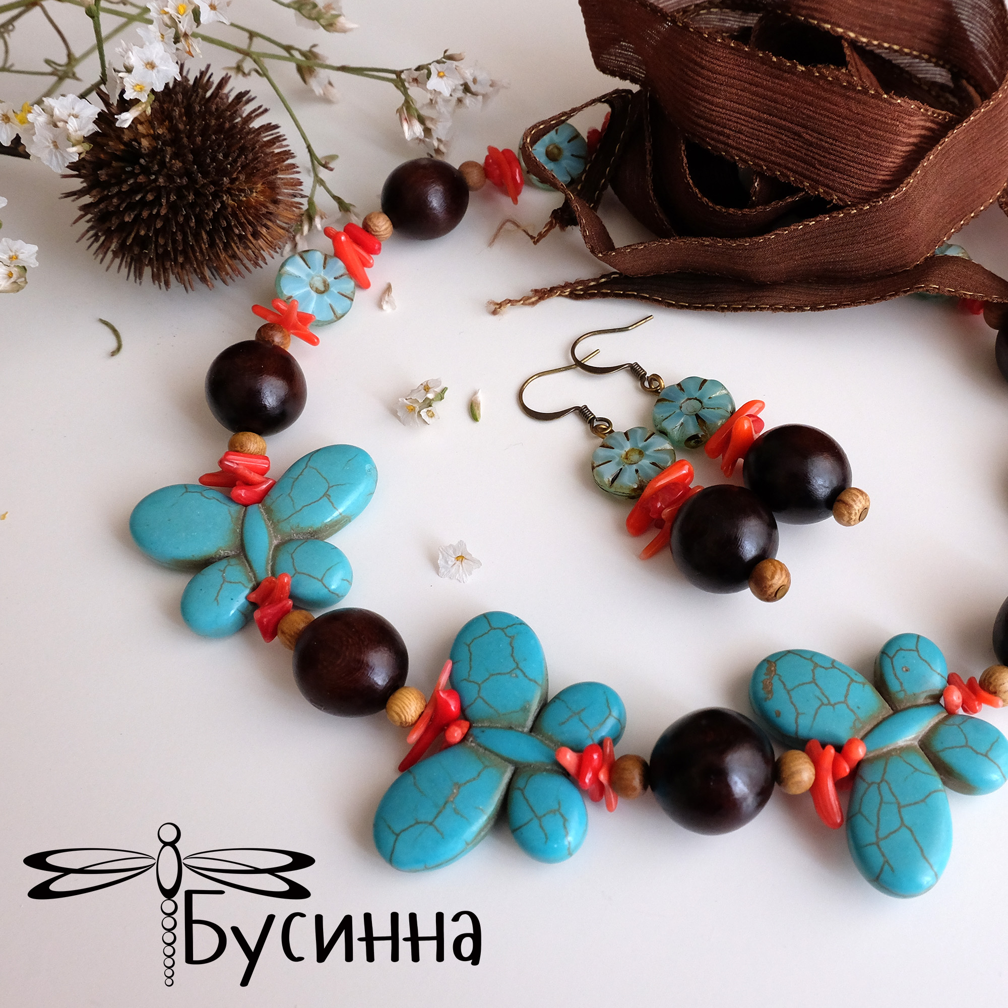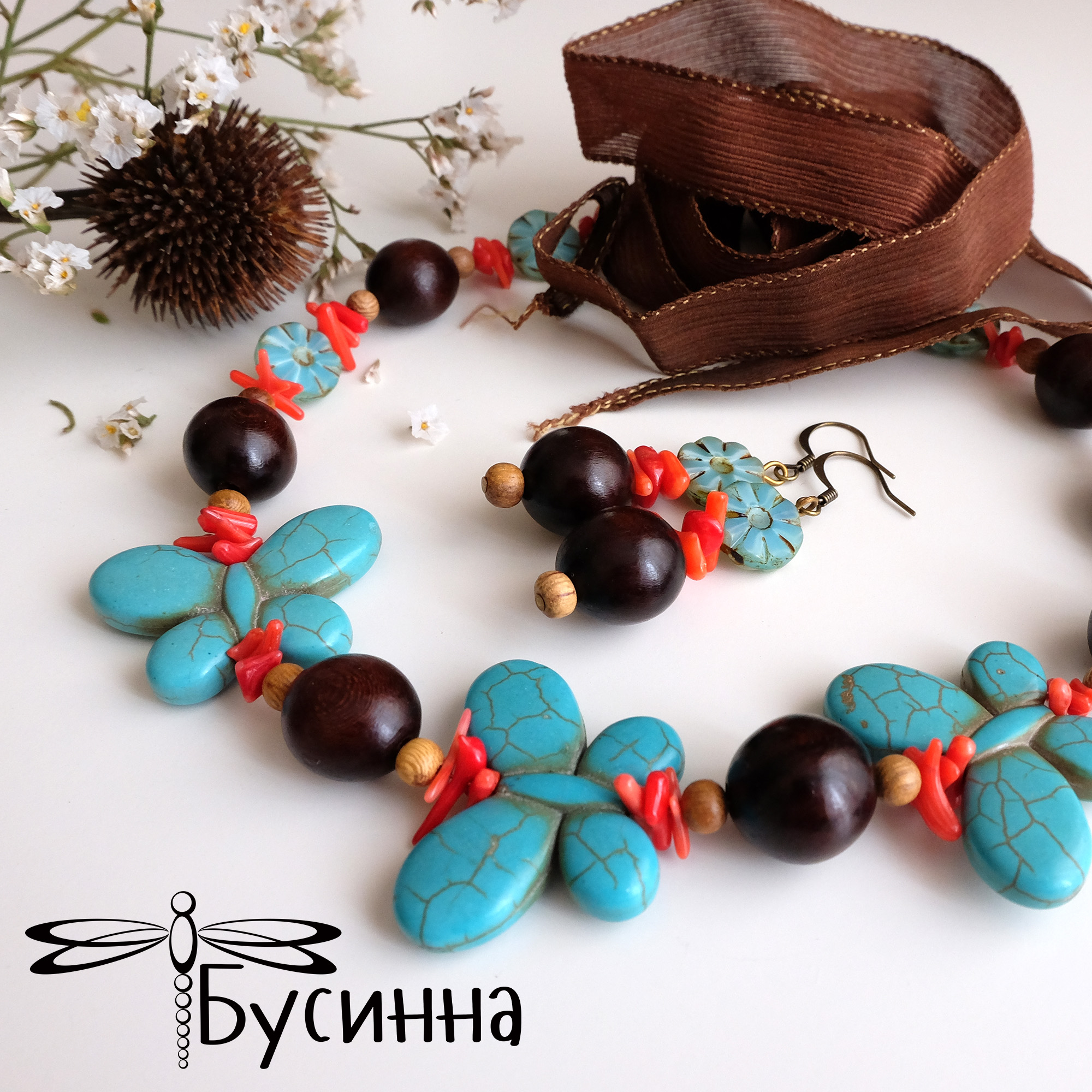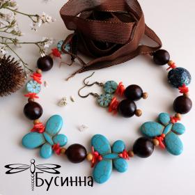 Бусы и серьги "Тропические острова" бирюзовые (2013) - бусина Чехия, лента шелковая, коралл, бусина деревянная , бусина ручной работы В. балашовой, турквенит натуральный (говлит), фурнитура