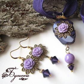 Кулон и серьги 'Утопая в сиреневой мгле...' (2014) -агат, бусина акриловая, жадеит, кристаллы Swarovski, лента шелковая, фурнитура США Размер серьги без швензы около 3,5 см, размер кулона около 6,4 см, ленту можно регулировать