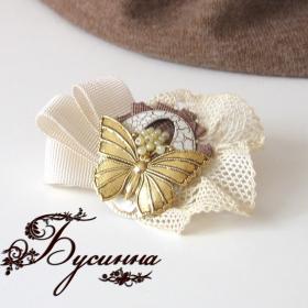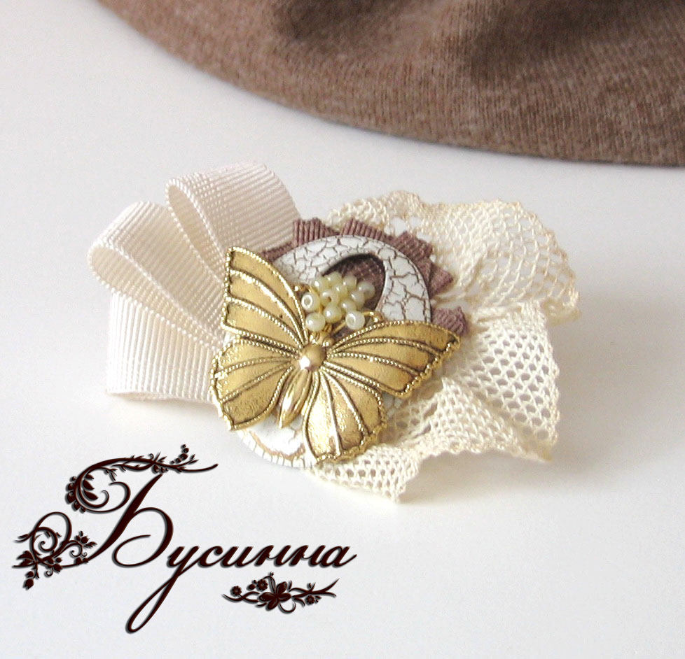 Брошь - Вальс бабочки - декоративный элемент -Бабочка- и -Овал-, кружево (возраст 30лет), бисер Чехия, тесьма, фурнитура