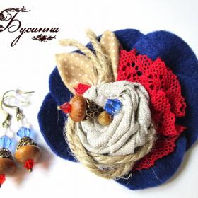 Брошь и серьги 'Вечерело ' (2013) - фетр, лен, хлопок, кружево, бусина деревянная, бусина Чехия, шпагат, кристаллы Swarovski, фурнитура США Размер серьги без швензы около 3 см, размер броши около 7*7,7 см