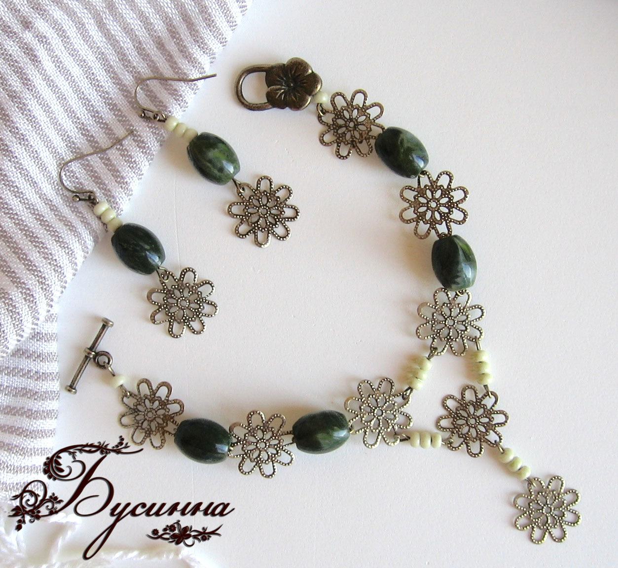 Полная фотография Вид украшения: КомплектГод: 2010В наличии: НетОписание: Браслет и серьги - Ветвь оливы - бусина, бисер, коннектор, фурнитура - античная бронзаМатериалы: бусинабисерконнекторфурнитура - античная бронза Войдите, чтобы оставлять комментарии