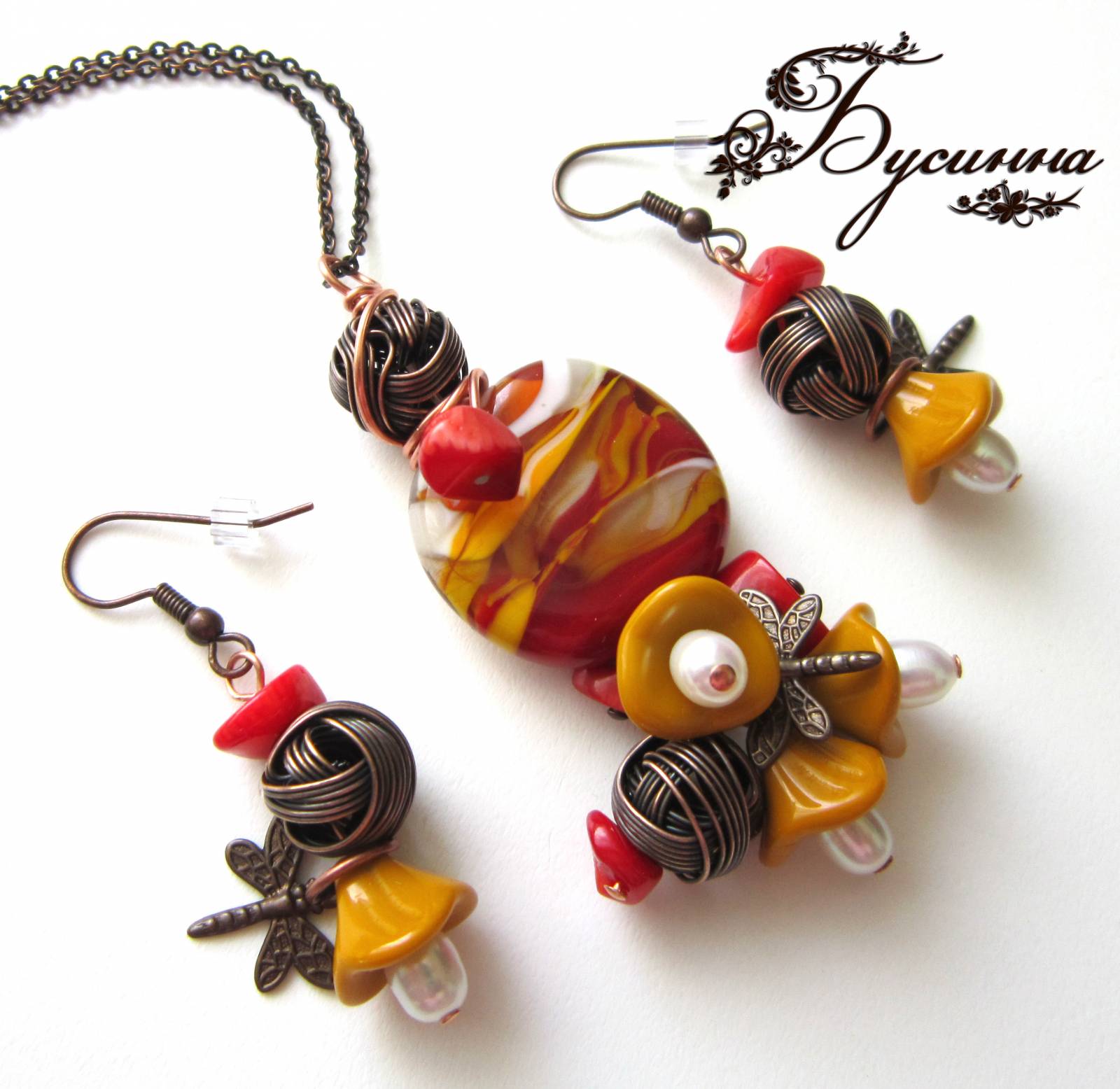 Кулон и серьги 'Яркий, солнечный, завораживающий' (2012) - коралл, бусина ручной работы В.Балашовой, жемчуг речной, бусина Чехия, фурнитура