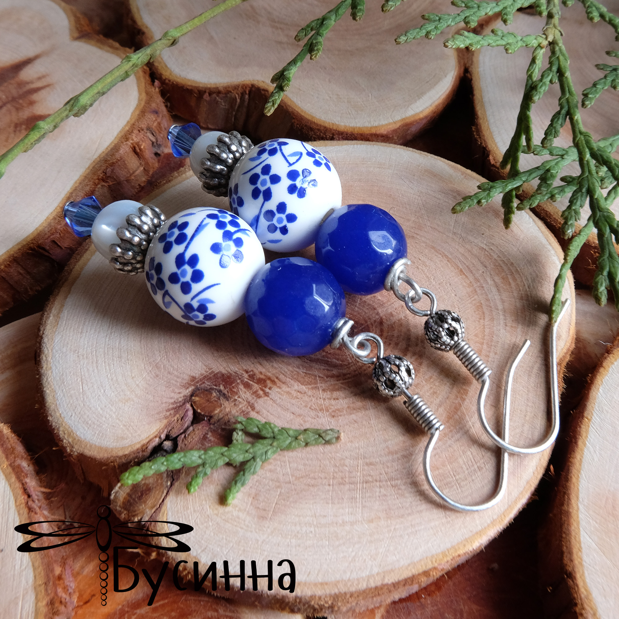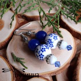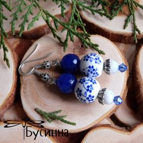 Серьги "Заманчивые своды" (2018) - кристаллы Сваровски, бусина фарфоровая, жемчуг речной, говлит, фурнитура США