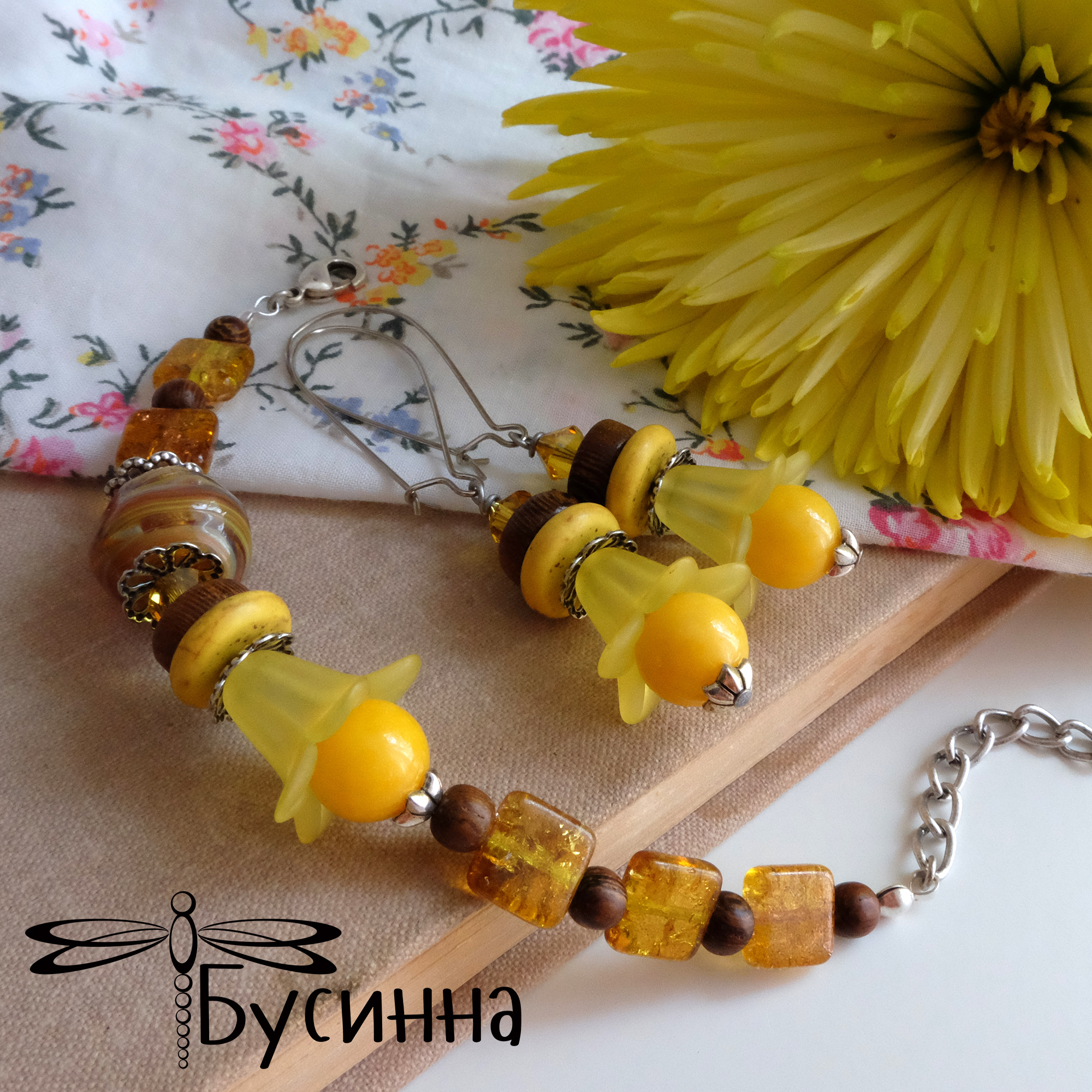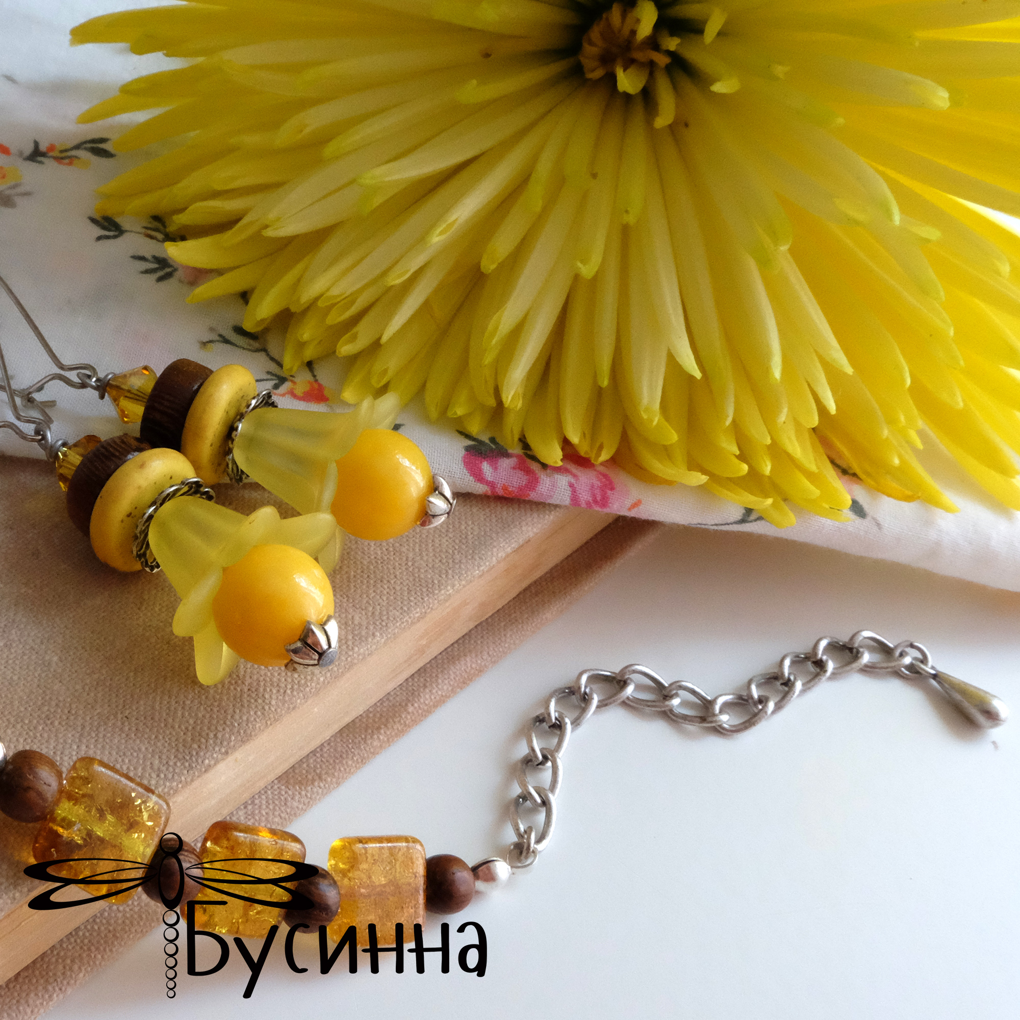 Комплект "Желтые цветы" (2017) - бусина деревянная, кристаллы Сваровски, говлит, бусина акриловая, бусина Чехия, фурнитура США, жадеит, бусина ручной работы В. Балашовой