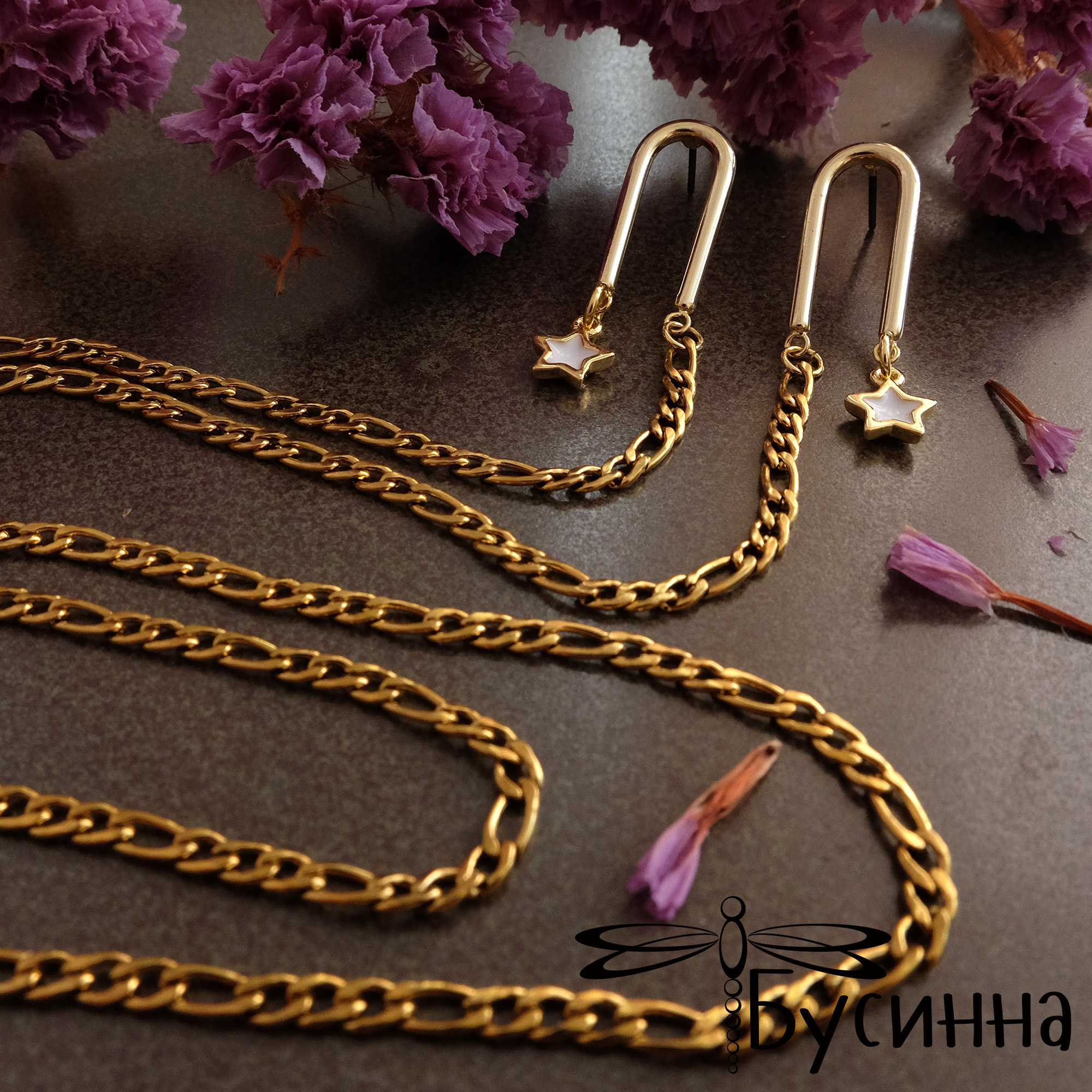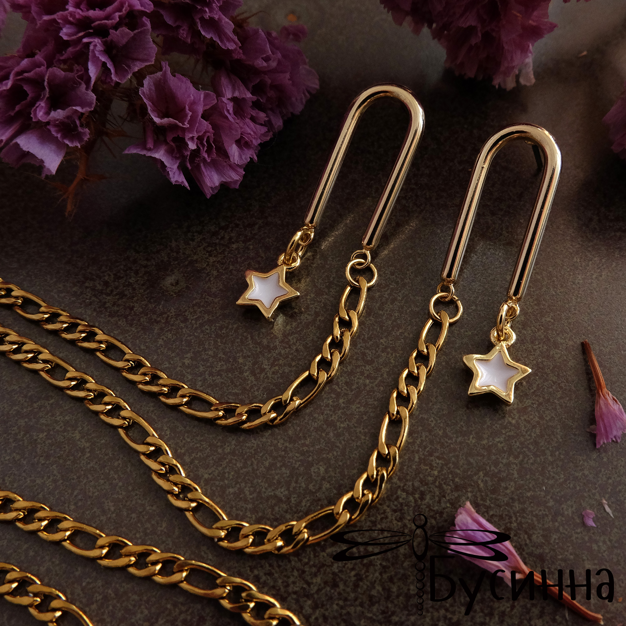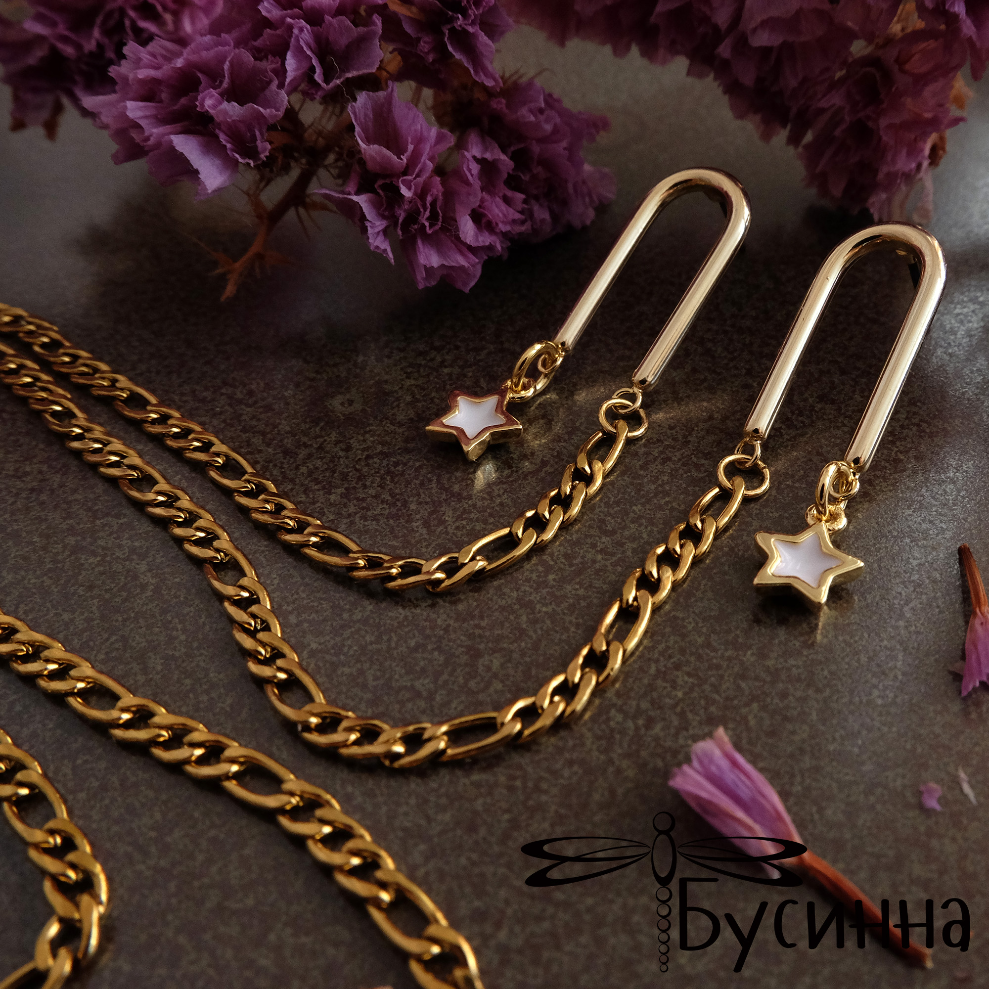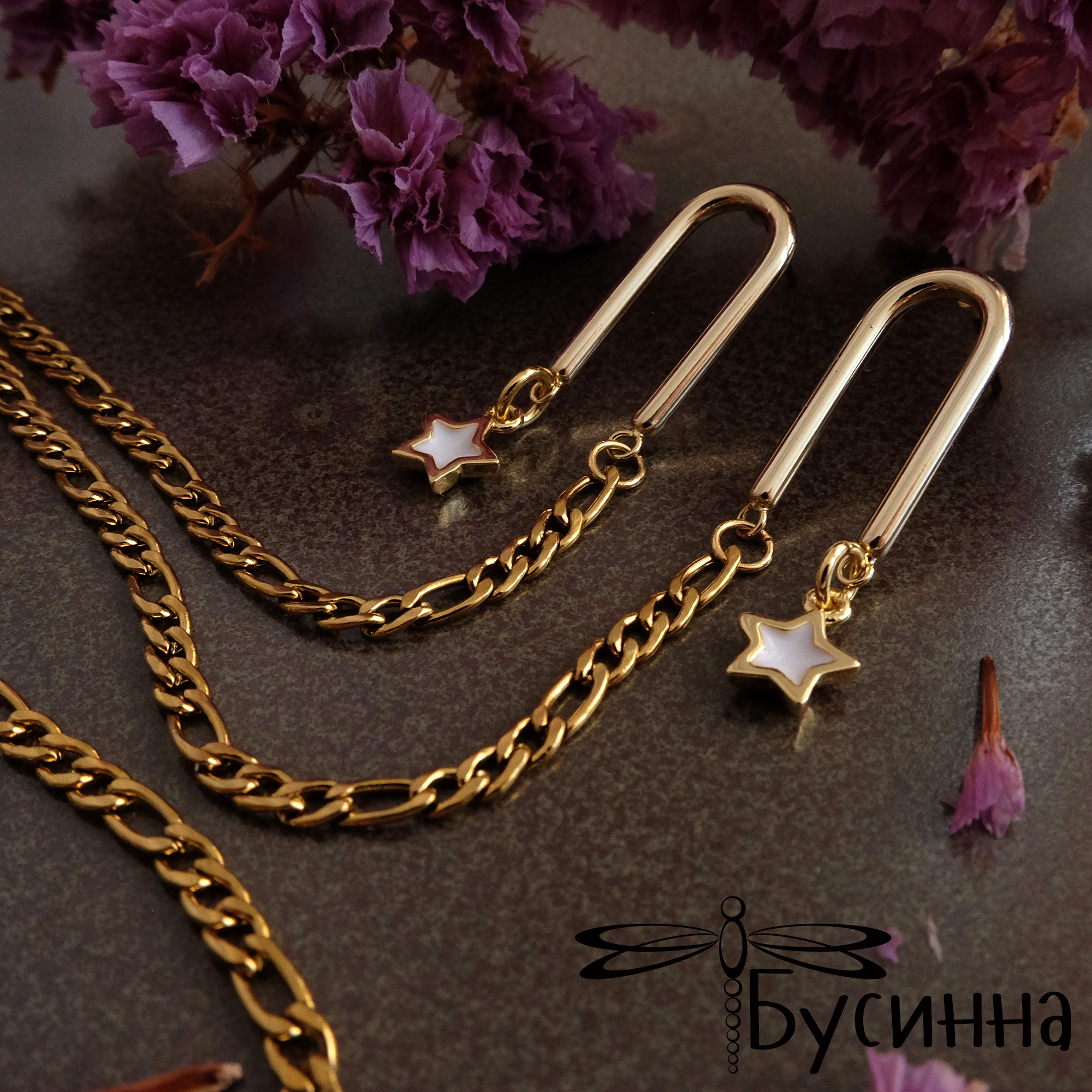 Серьги - пуссеты "Звездопад", соединенные цепью (2020) - фурнитура Южная Корея  из латуни с покрытием золото 22К, пин - сталь, цепочка - сталь с покрытием золото 22К, подвеска - латун с покрытием золото 22К, внутри цвездочки белая эмаль