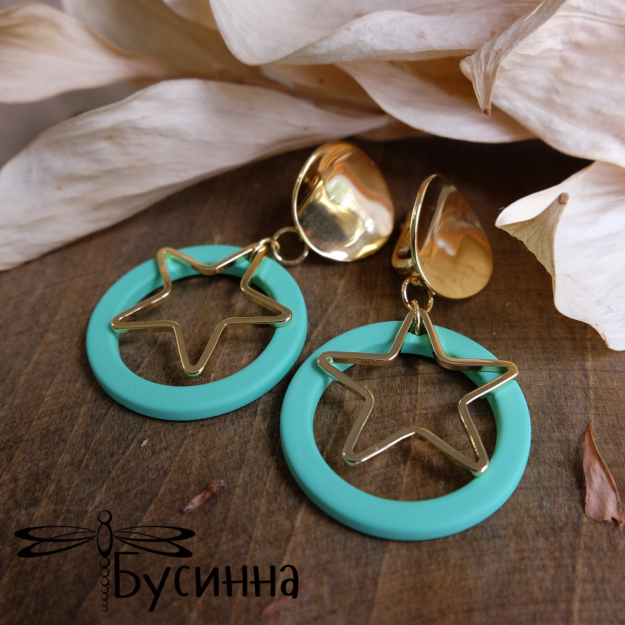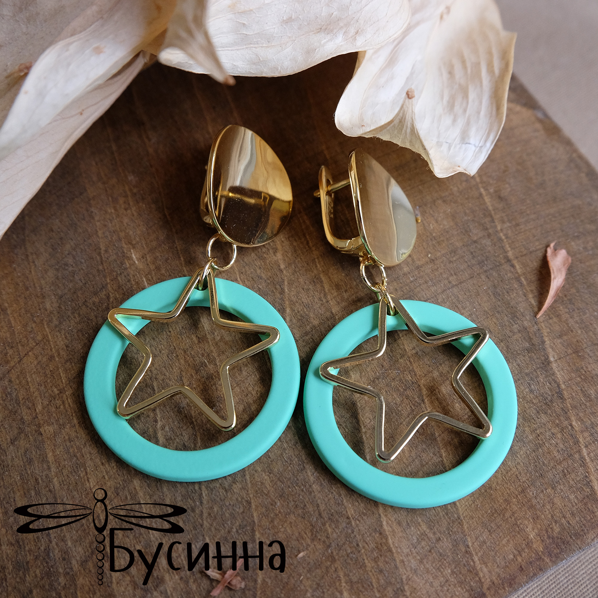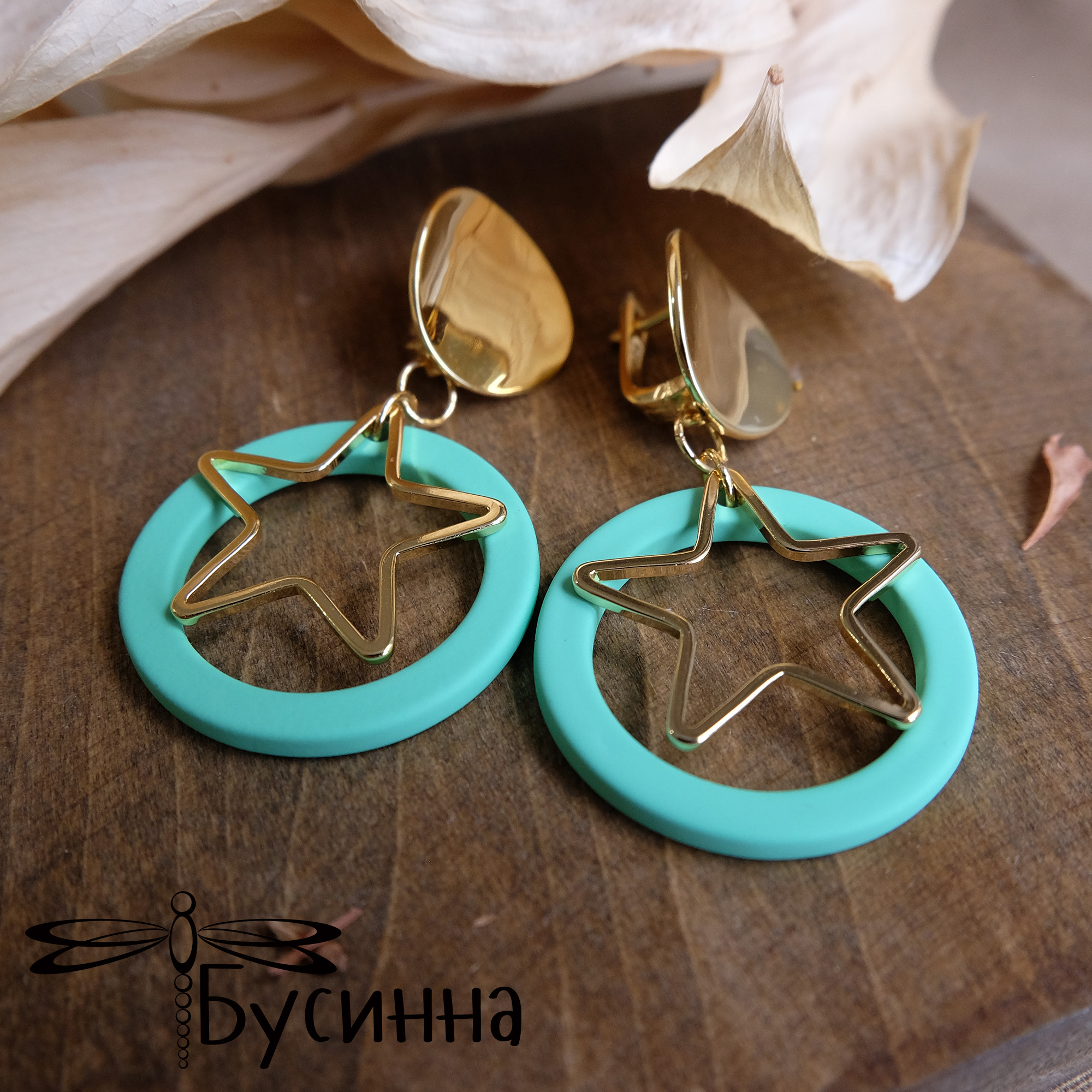 Серьги с английским замком "Звезды Диско" мятные (2020) - фурнитура Южная Корея из латуни с покрытием золото 22К, пластик Южная Корея. Цвет украшения на экране может отличаться от реального.